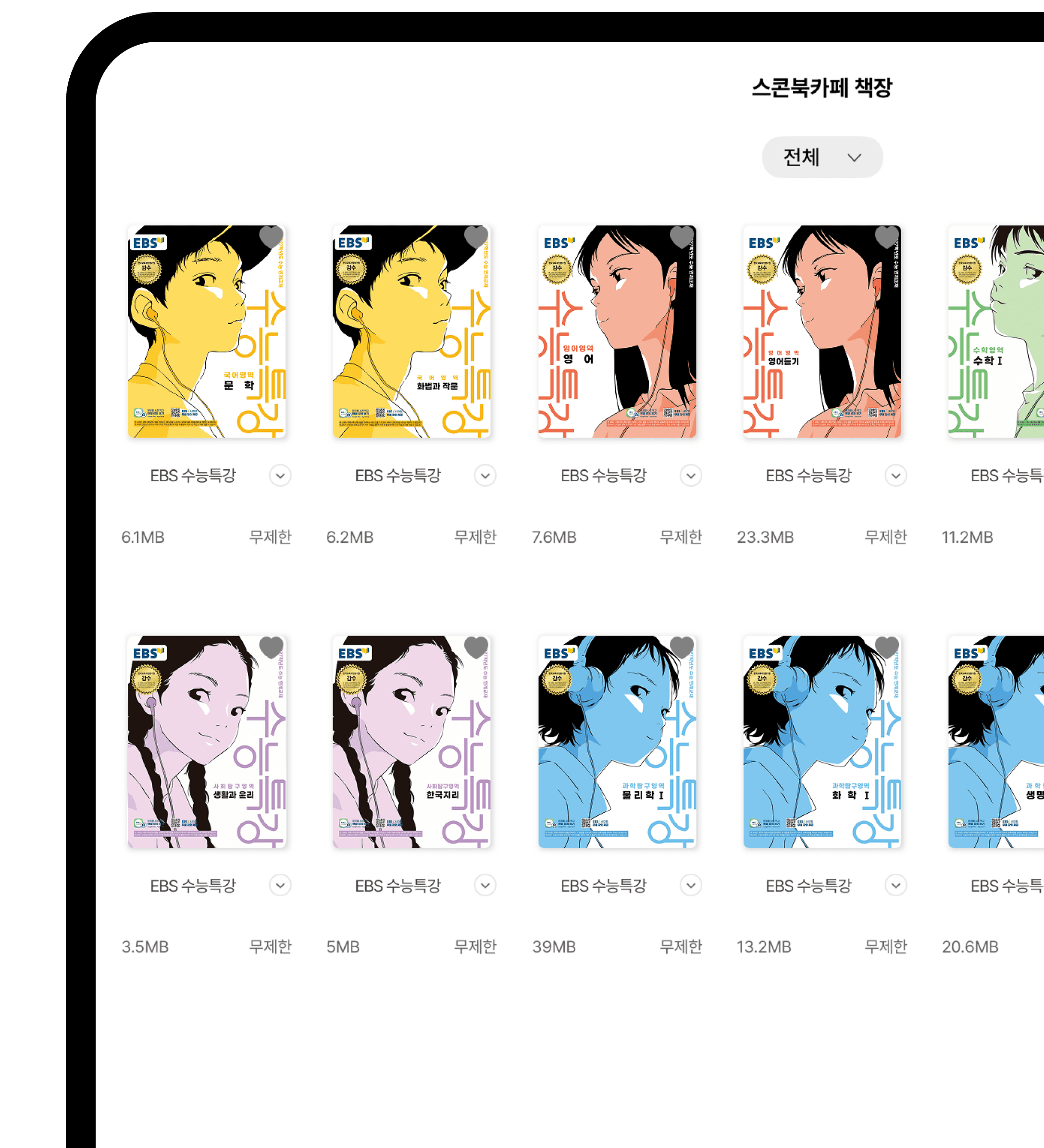 교실, 독서실, 카페 어디서든 수능특강, 수능완성 .전 과목 교재를 바로 펼칠 수 있습니다.